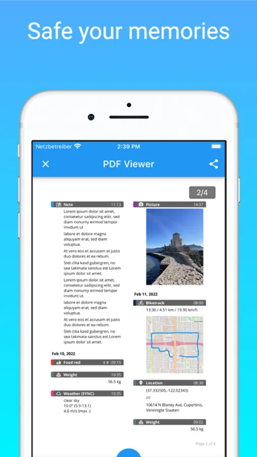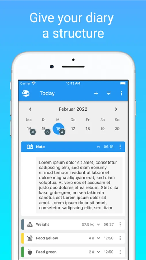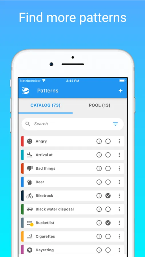 Nuggets offers a big catalog of patterns, which you can directly use OR copy and adjust to your individual needs. Entries base on a pattern, are adjustable, commentable, reportable, exportable and printable. You don’t like Nuggets any more? No problem: You keep your diary as PDF.