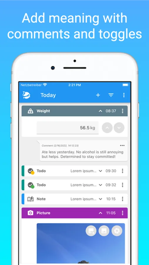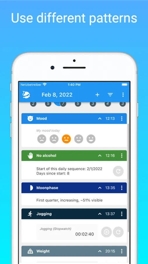 Nuggets does not restrict or limit what you want to log. No more “How’s your mood today?” - if you don’t want it! With DayLog you can log, what, when, how often and how you want it! Logging with Nuggets is quick and easy.
