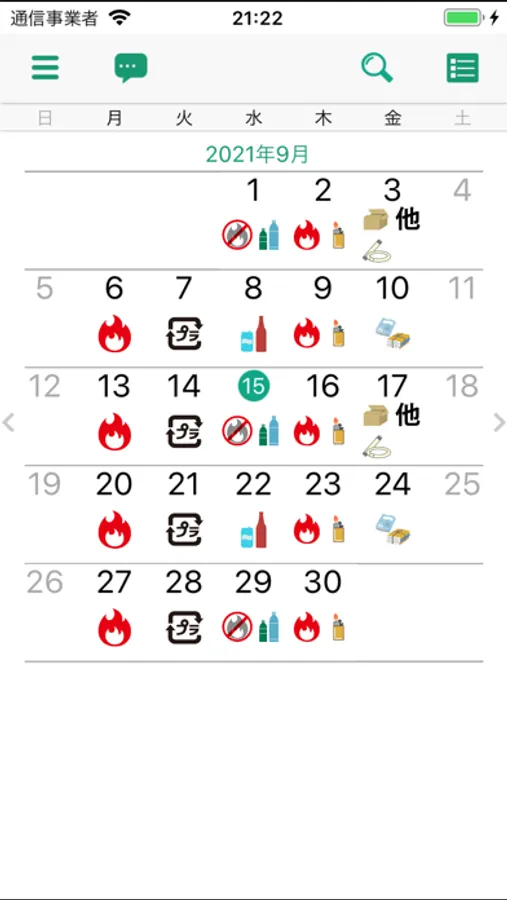 収集予定のごみ種別を前日と当日にアラートでお知らせします。時間は自由に設定することができます。