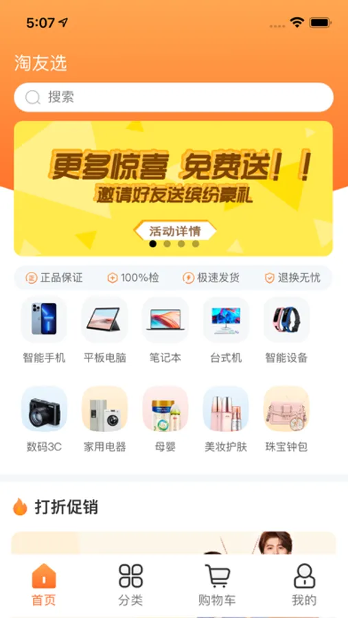 核心功能:保证商品100%正品行货同时可邀请好友参与减免,享受商品更低价特性。