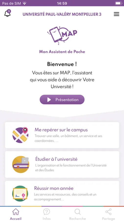 MAP est l'Assistant de Poche qui facilite l'accueil, l'intégration et la réussite de l'étudiant.