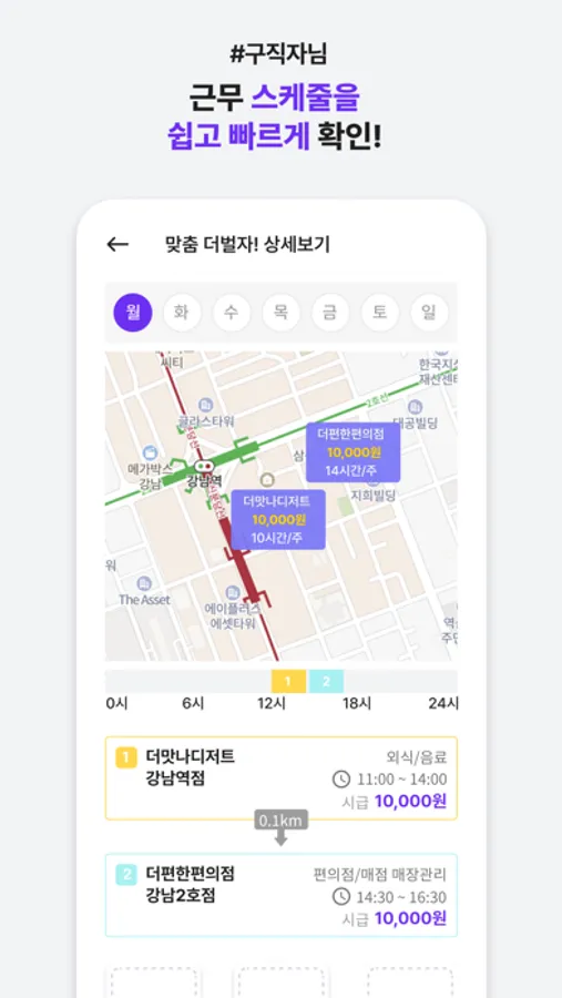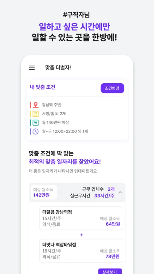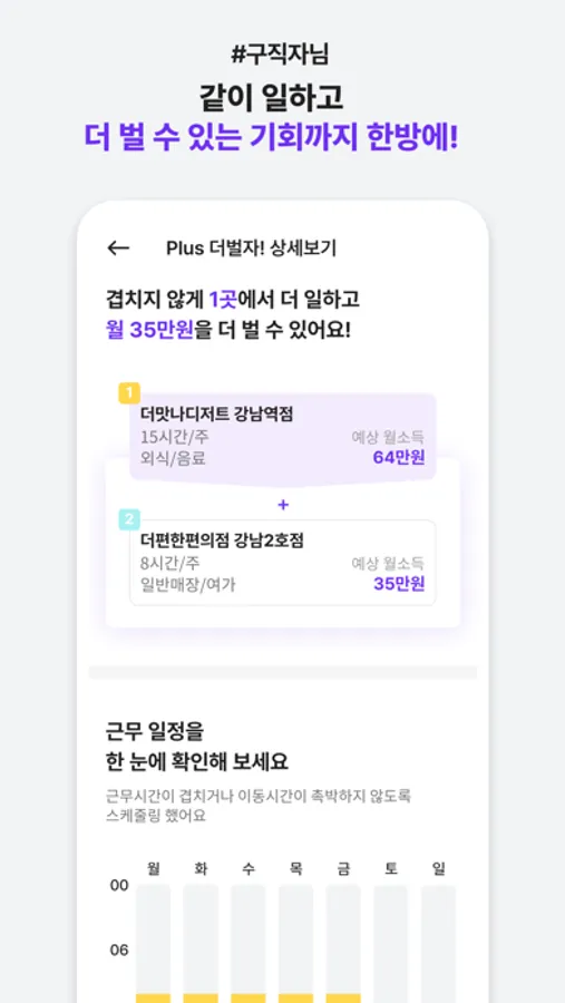단 1클릭으로 더 벌 수 있는 모든 기회(일자리, 인재)와 최적의 근무 스케줄을 한방에 찾게 해주는 가장 쉬운 구인구직 앱입니다.