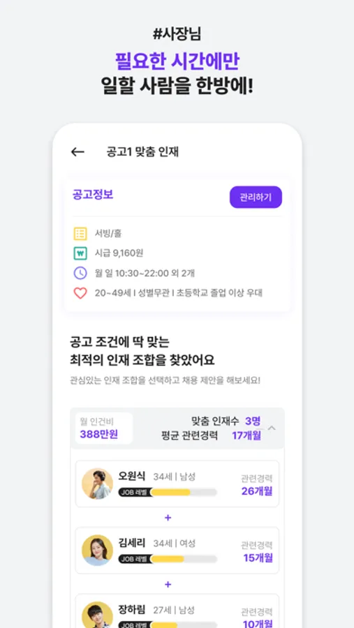 - 필요한 시간에만 채용하시고, 인건비를 절약해보세요.
