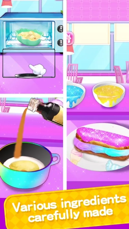 Rainbow lovers! Here is this super cute rainbow themed food cooking game for you! With lots of rainbow food recipes, you will learn how to make these beautiful and delicious desserts. Rainbow donuts, Éclairs, pancakes, churro ice cream sandwiches, macaroons, smoothie and more rainbow food! Get ready to taste lots of delicious rainbow food, little chefs!