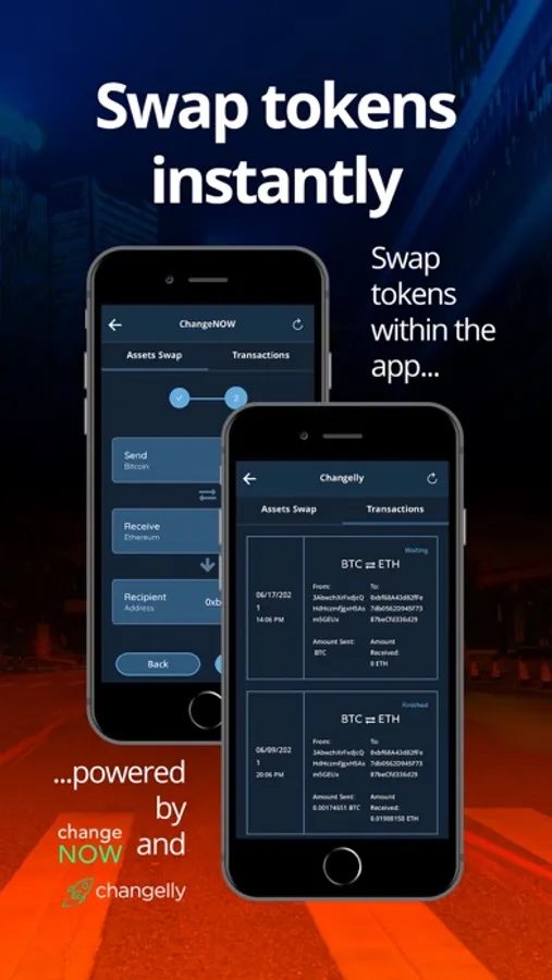 • It has a built-in decentralized exchange powered by ChangeNOW and Changelly. Swapping and exchanging of supported tokens is fast and automatically reflects on your wallet's balance.