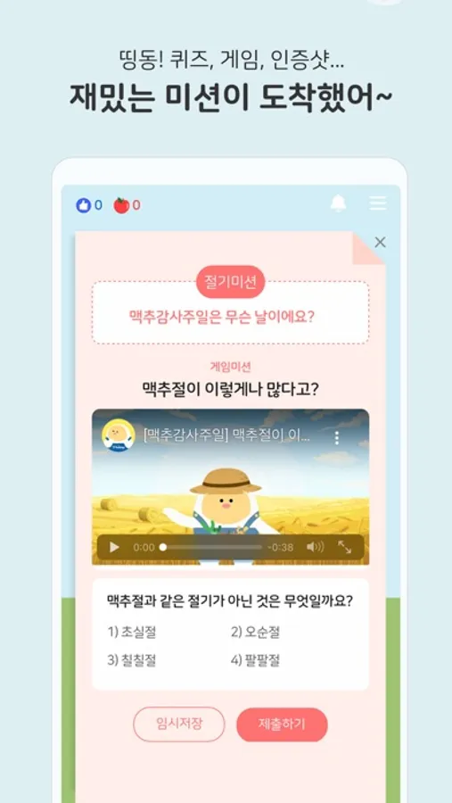 미션의 종류는 일일 미션, 퀴즈 미션, 인증 미션 등이 있으며 제공되는 미션을 부서의 상황에 맞게 임의적으로 변경하여 사용할 수 있습니다.