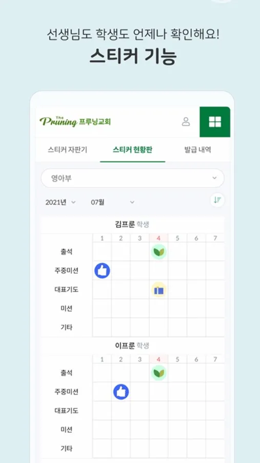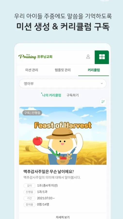 학생들은 열매를 얻기 위해 미션을 참여하고 자연스레 하나님의 말씀을 가까이 하게 됩니다. 학생들은 교사의 피드백을 확인할 수 있으며, 지난 미션들을 돌아보며 참여 의지와 동기부여를 갖게 합니다.