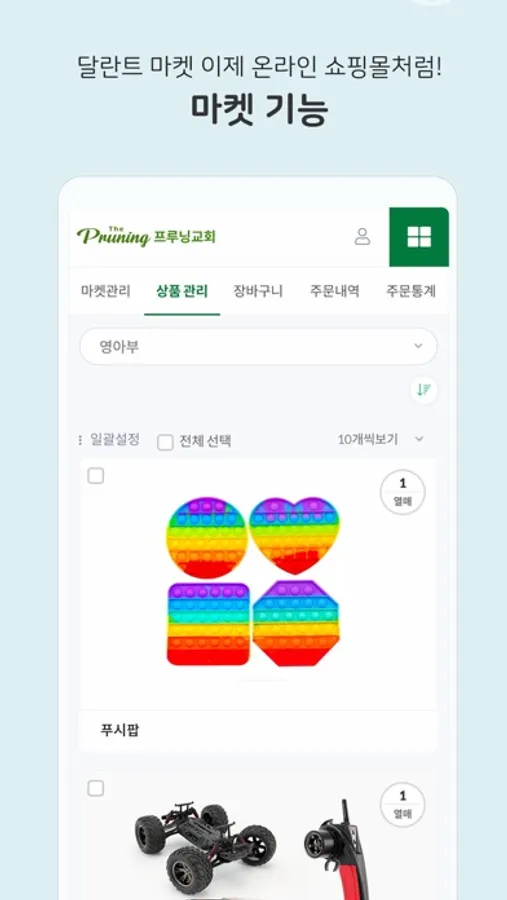 다양한 상품을 부서의 상황에 맞게 편집, 등록 할 수 있고 마켓 오픈 기간을 설정하여 [온라인 달란트 시장]을 운영할 수 있습니다.