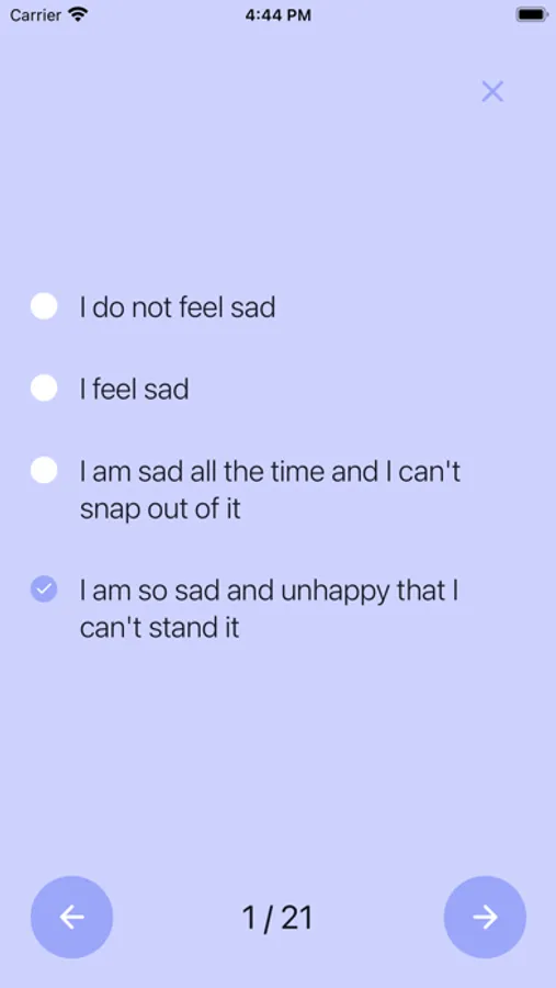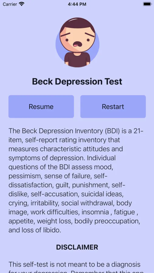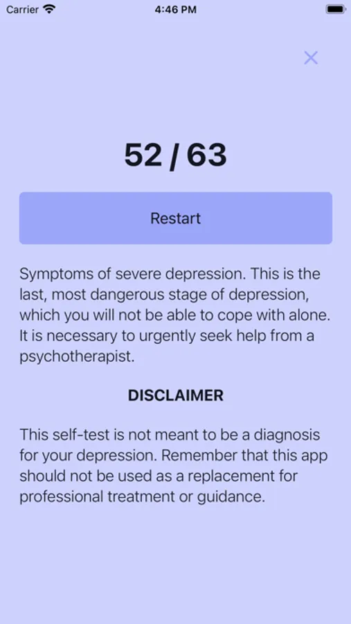 This self-test is not meant to be a diagnosis for your depression. Remember that this app should not be used as a replacement for professional treatment or guidance.