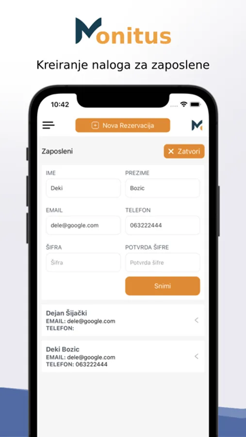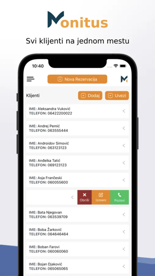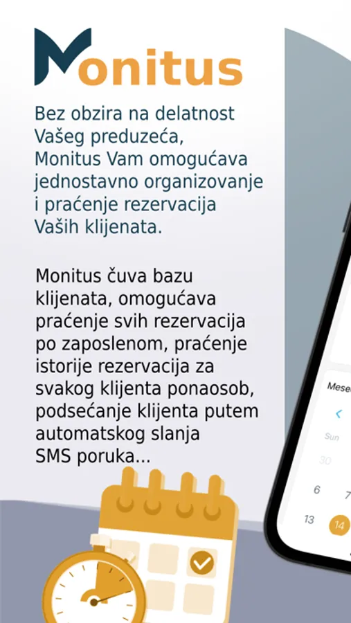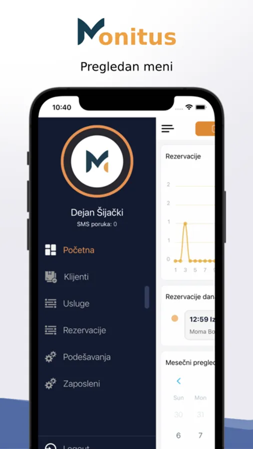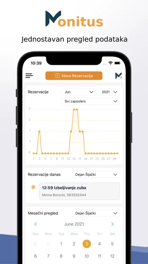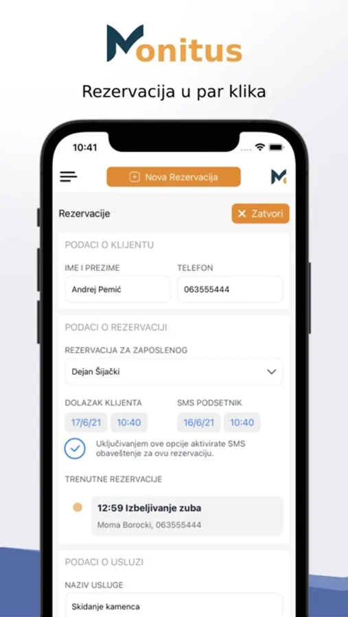 Monitus Vam pruža mogućnost organizacije rezervacija Vaših klijenata, praćenje rezervacija po zaposlenom, istorijat rezervacija svakog unetog klijenta uz mogućnost slanja automatskog SMS podsetnika.