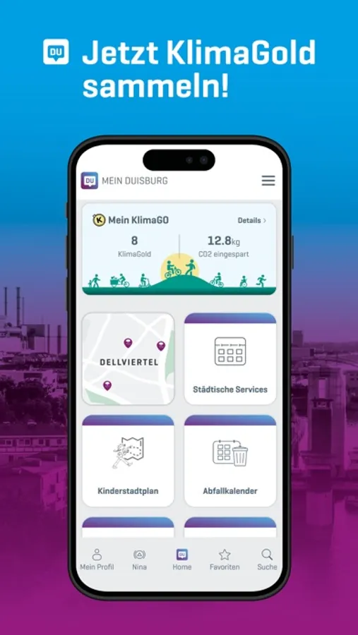 KLIMAGO: Leave your car at home and collect KlimaGold coins for every kilometer you walk, cycle or use public transport. Activate your profile in the MEIN DUISBURG app. You can redeem your KlimaGold points at selected partners.