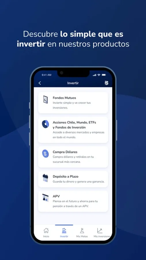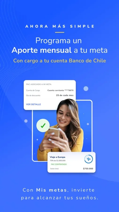 - Simular, crear y monitorear tus metas de inversión, definiendo el plazo y monto de ahorro mensual necesario para acercarte a tus sueños y proyectos. Si eres cliente del Banco de Chile, podrás programar aportes mensuales automáticos con cargo a tu cuenta (PAC).