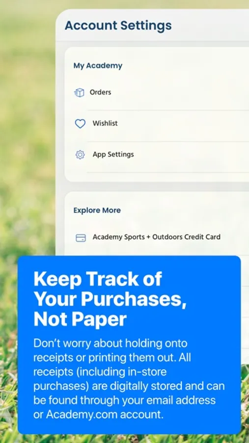 Wave goodbye to paper receipts and get digital copies of your app, online, and in-store purchase receipts sent to your Academy.com account.