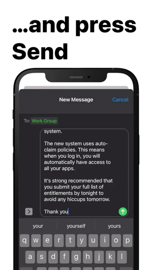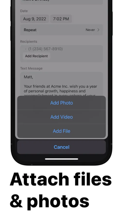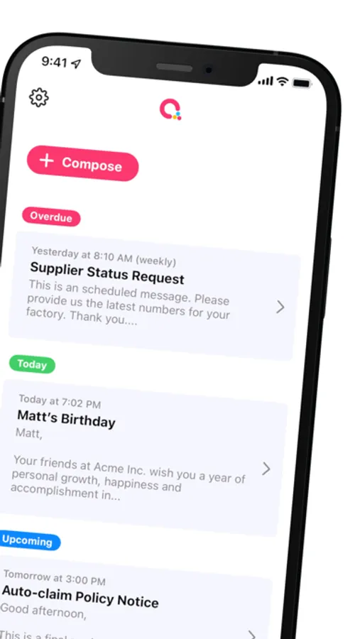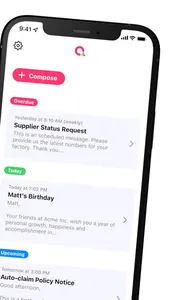Kyew (pronounced "Q") will save your message, including any attachments, and send you a notification at the scheduled time. Upon opening the notification, your pre-composed message will be ready to send in one tap.