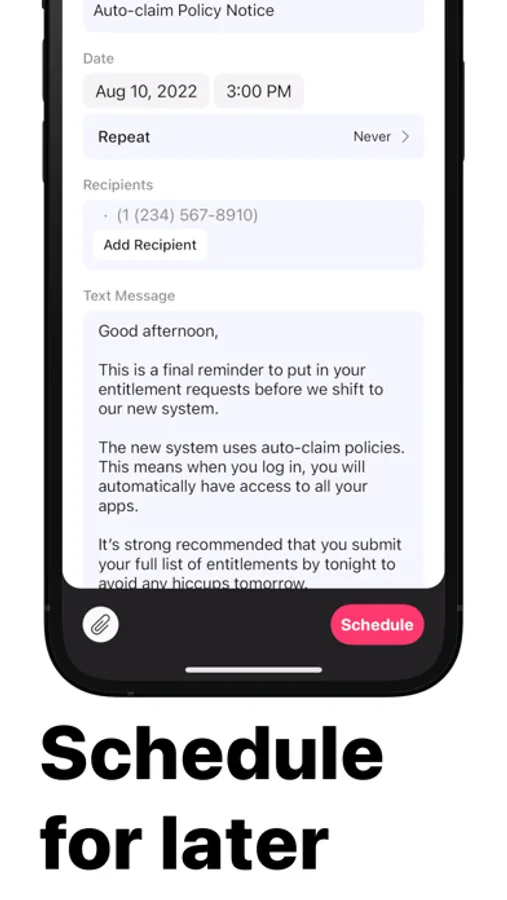 You can set up a recurring schedule to send text messages daily, weekly, monthly, or yearly. This is ideal for both personal and business use.