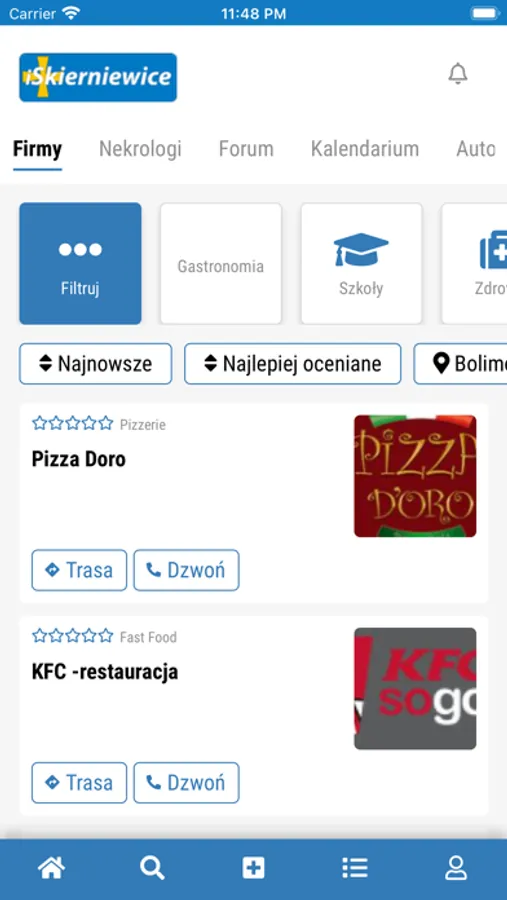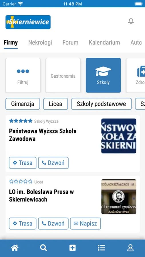 W aplikacji znajdziesz bogatą bazę firm i instytucji z terenu Skierniewic. Lekarze, usługi zdrowotne, telekomunikacja, gastronomia, usługi finansowe, szkoły, sklepy - wszystko w jednym miejscu. Jeśli szukasz optyka, ginekologa czy dentysty - dobrze trafiłeś. W naszej bazie także liczne punkty gastronomiczne, sklepy, firmy telekomunikacyjne i wiele innych.