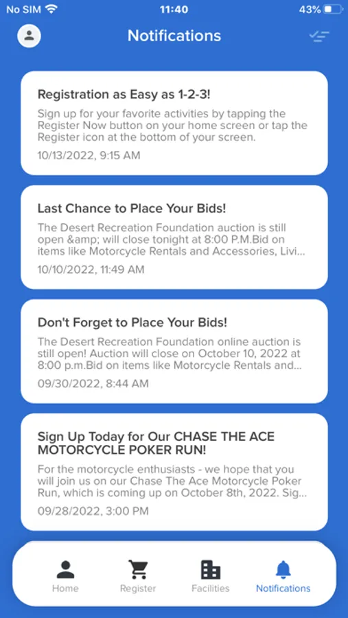 on the profile page, view your favourite facilities, favourite activities and completed activities.