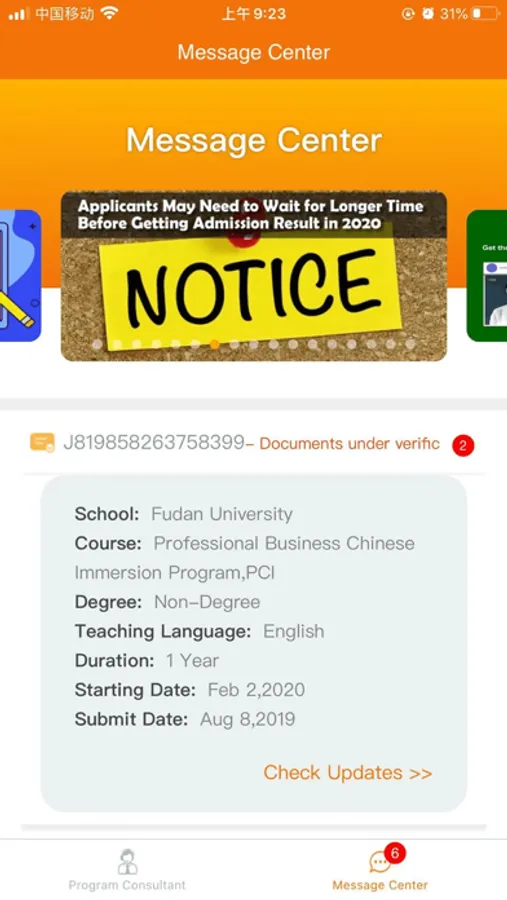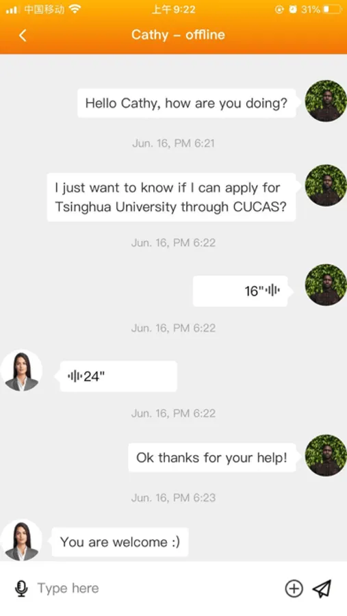 CUCAS Messenger enables you to chat with CUCAS(www.cucas.cn) counselors and get your questions regarding studying in China answered easily. It also helps you to get the latest update of your application to Chinese universities fast and conveniently, in case you miss any important notifications in the process of applying to a university in China.