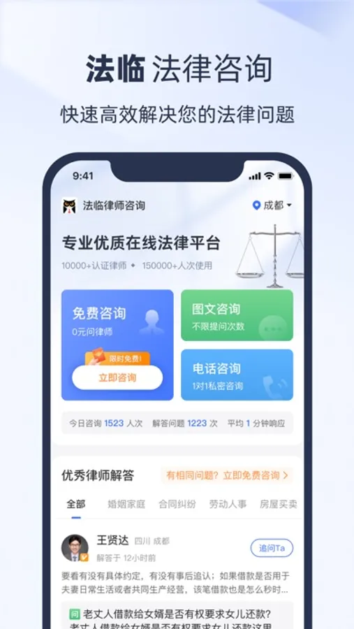 法临-24小时在线律师咨询,一对一法律咨询服务提供专业法律咨询、律师咨询、打官司、追欠款、代写合同文书以及专业法律问答覆盖婚姻家庭纠纷、劳动仲裁、交通事故、遗产继承、债权债务、侵权赔偿、房产纠纷、建筑工程等众多领域以及离婚起诉书、法律文书、裁判文书等法律服务,帮您快速解决各种法律问题。【打官司在线服务】民事、商事、刑事、行政、执行等案件分析、案件委托、案件起诉服务【找律师】多维度展示律师信息:执业律所、擅长领域、执业年限、教育经历、资格证书等,为您选择满意的律师提供参考。【法律问答】各类型法律问题一问多答,执业律师在线解答,极速响应,支持图文的形式进行提问。可查看以往常见法律问题,查看律师各类解答,了解更多法律常识。【全国多个城市律师入驻,24小时提供在线咨询,快速解决法律问题】