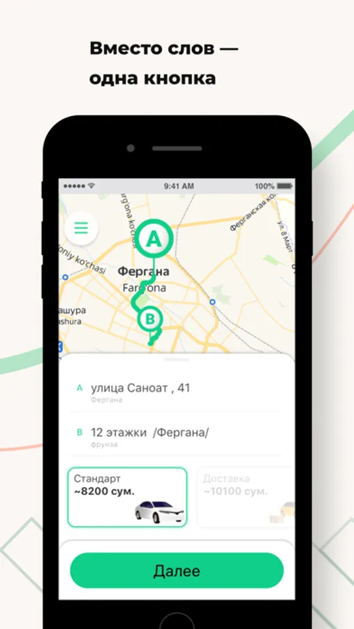 Закажите Taxi Okey в городах Фергана, Кувасай, Турткуль и Маргилан через приложение. Это в 3 раза быстрее, чем по телефону! Между желанием доехать до нужного места и поиском автомобиля — пара секунд.