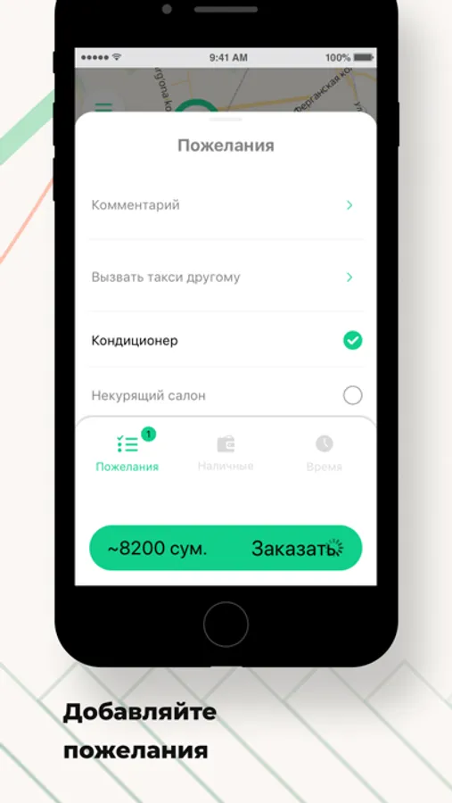 Добавьте к заказу дополнительные пожелания. Например, когда на улице +35 — выберите "кондиционер". Если вы не переносите запах табака — укажите "Некурящий салон", и к вам приедет некурящий водитель.
