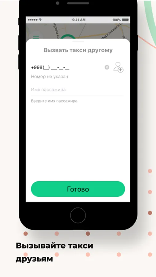 Используйте опцию “Вызвать такси другому” в разделе “Пожелания” и укажите его номер телефона. Когда такси подъедет, на указанный номер придет СМС, а вам — сообщение в приложении.