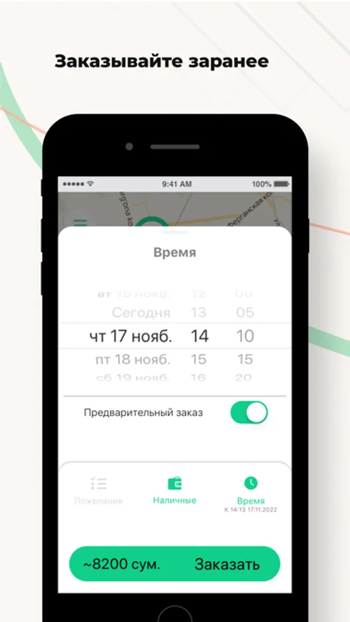 Выберите опцию “Предварительный заказ”. Поиск автомобиля начнется незадолго до заказа поездки, и автомобиль приедет к назначенному времени. Также вы будете заранее знать стоимость поездки.
