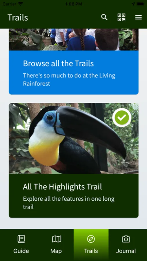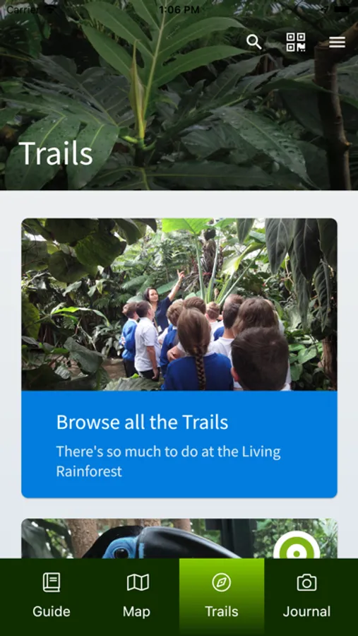 Welcome to the Living Rainforest Explorer app. Explore the wonders of the Rainforest using our live map and by completing the trails. Take photos and collect your favourite things. You can also take an animal home with you using the magic of Augmented Reality.