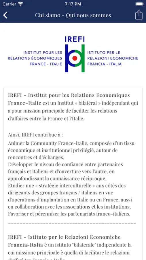 IREFI - Institut pour les Relations Economiques France-Italie est un Institut « bilatéral » indépendant qui a pour mission principale de faciliter les relations d’affaires entre la France et l’Italie.