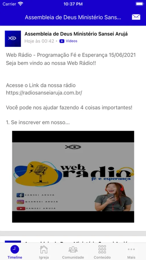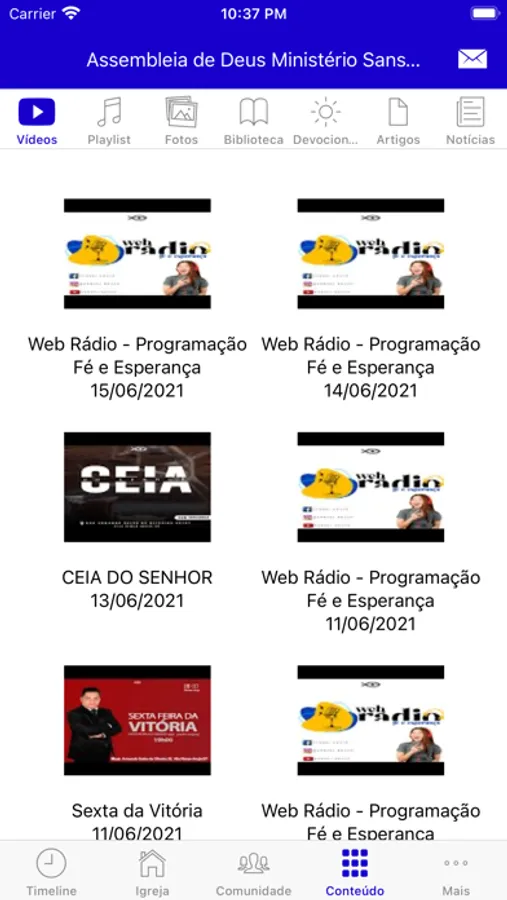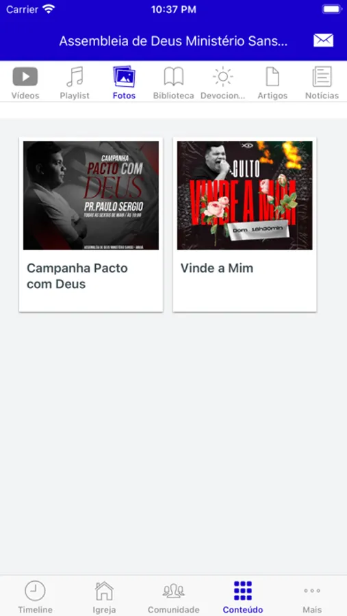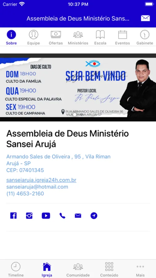 - Informações da Igreja (endereço, telefone, site, redes sociais, pastores)
