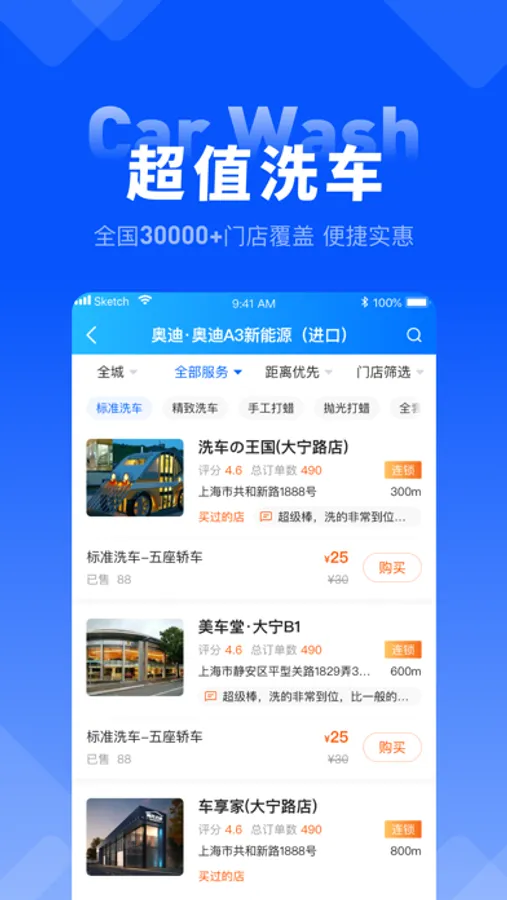 1、特惠洗车:全国30000+门店覆盖,尽享全城优质汽车服务;