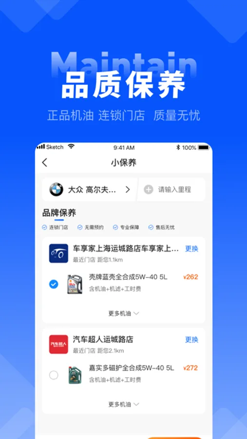 3、汽车保养:精准适配车型,品牌机油,专业技师,连锁门店;