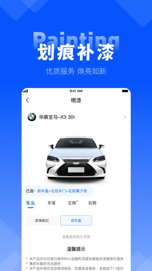 3、漆面修复:专业技师服务,省时省心修复漆面,服务贴心;