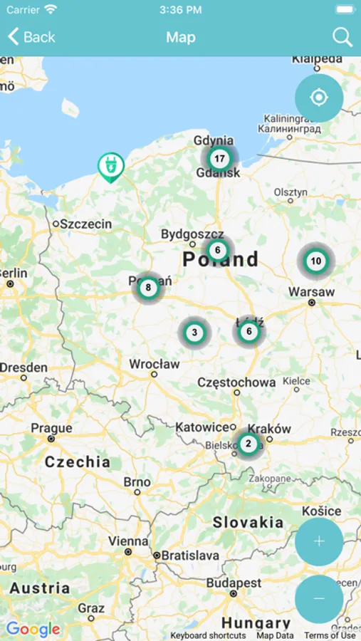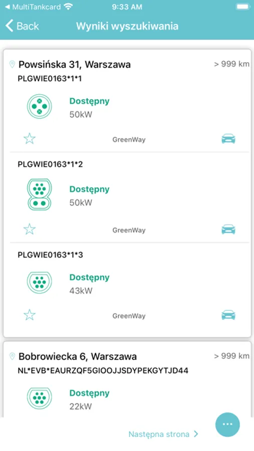 Aplikacja pokaże w stacje ładowania w kolejności od znajdującej się najbliżej. Możesz także wyszukiwać podając miasto, kod pocztowy, lub numer stacji. Stacje znajdujące się dalej mają dalsze miejsce na liście stacji. Możesz także wyszukiwać stacje z mapy.
