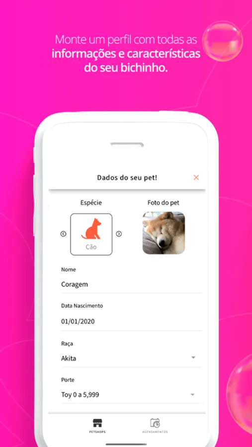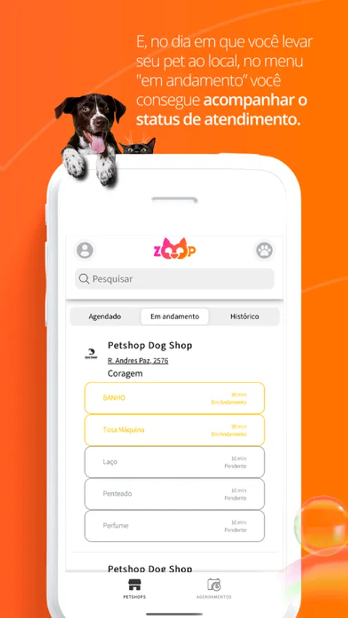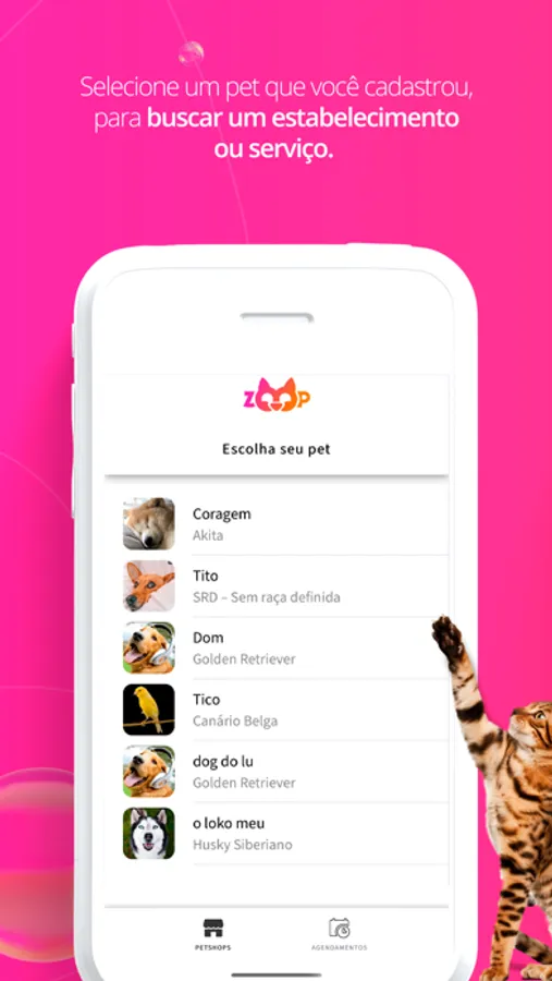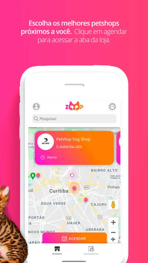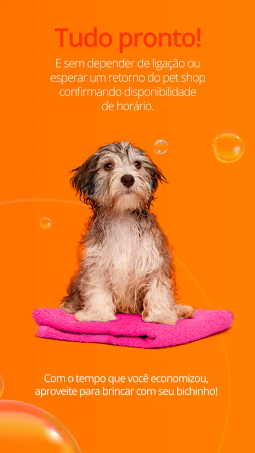 Escolha um pet cadastrado para encontrar os melhores pet shops próximos a você ou o que você mais gostar, veja todos os serviços disponíveis para seu tipo de pet, dias em que o seu pet pode ser atendido, valores dos serviços escolhidos e tempo estimado para o atendimento;