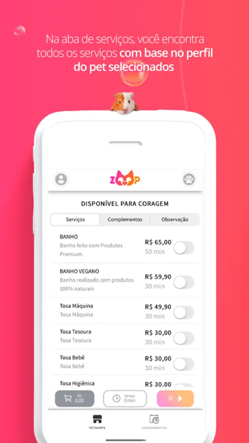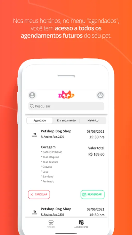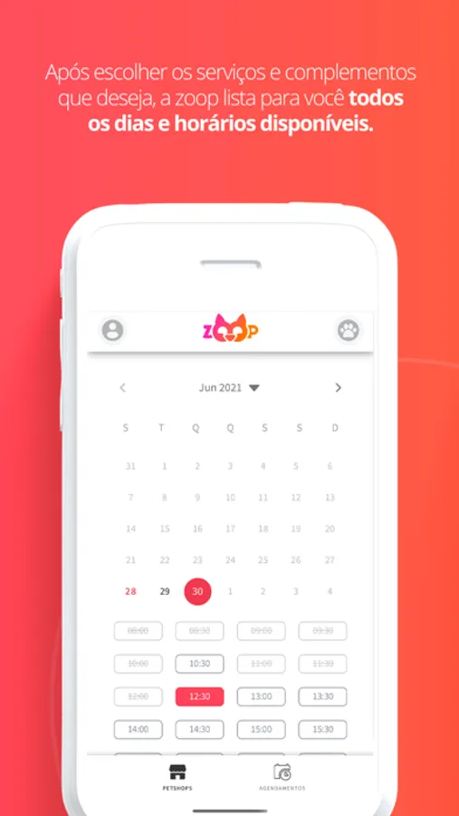 Teve um dia corrido, passou do horário e você esqueceu de agendar o banho do seu pet? Agora você não precisa mais esperar até o outro dia para ligar e ver se ainda tem horário disponível, com a zoop, você pode escolher e agendar os serviços que seu pet precisa, de onde você estiver, com agenda disponível, 24 horas, 7 dias por semana;