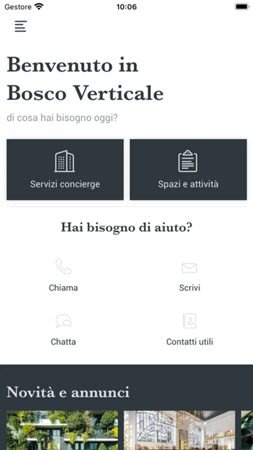 App per visualizzare servizi, attività e spazi presso Bosco Verticale - Torre E, effettuare prenotazioni e contattare il concierge.