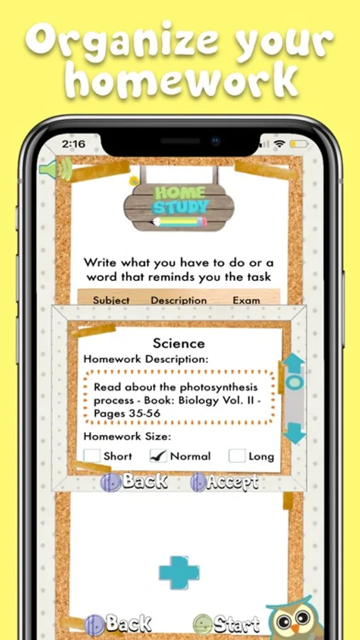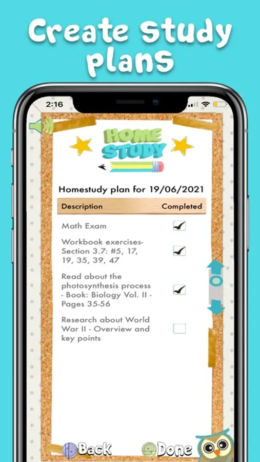 Homestudy is the best educational app that creates study plan schedules everyday for your kids based on effective rules that lead to higher academic performance. Homeworks, exams, projects, house tasks are organized in an effective timetable that should be followed with a determination to achieve progress and results.