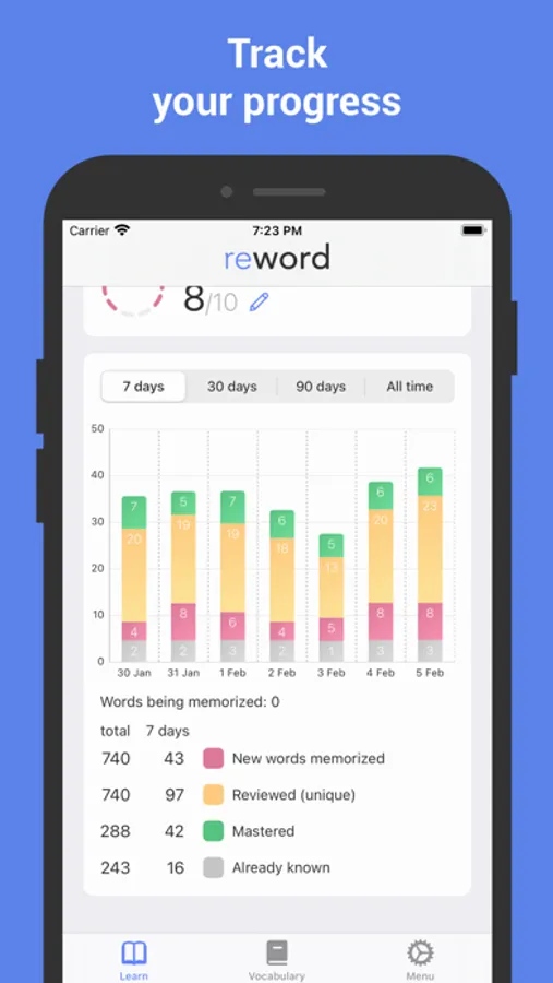• Statistics: track your performance in learning Japanese words for the last week, month, three months and the last year.
