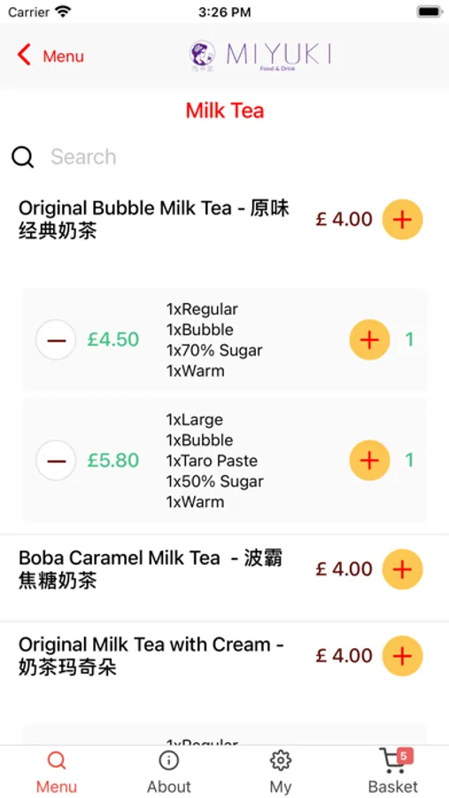 Miyuki is a very famous brand name of bubble milk tea and Taiwanese braised dish takeaway across Loughborough in the UK for decades, the dedicated chefs made the delicious drinks and Taiwanese braised dishes in our kitchen with their unique skills. Today, we are very proud to provide our top-level bubble milk tea and Taiwanese braised dishes service in your community, we always committed to giving our customers the best taste of bubble milk tea out of the ingredients.