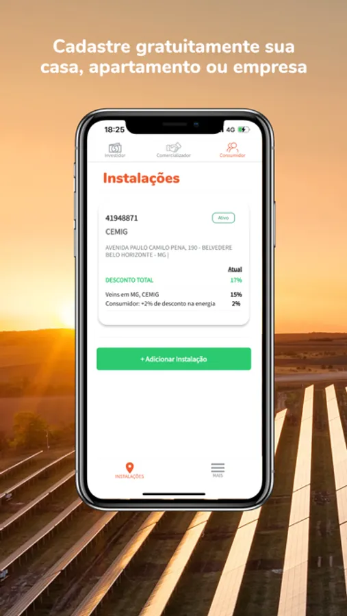 Faça seu cadastro gratuito no app, adicione as contas de energia que você quer ter desconto, e economize até 20% usando energia limpa, todo mês.