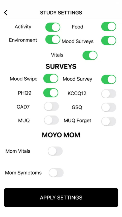 Moyo Health Network is a mobile application for members that are consented research participants. This application allows participants to track their blood pressure, heart rate, steps, mood and other features such as weather and pollution levels. Pregnant and postpartum participants are able to track their vitals and symptoms related to high blood pressure. This application integrates with HealthKit in order to deliver clean and effective surveys.