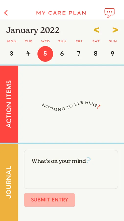 Use our Care Plan to keep tabs on your well-being. Check up and check off Action Items created by your care provider specifically for you and journal your progress so both you + your provider stay aligned on your care goals.