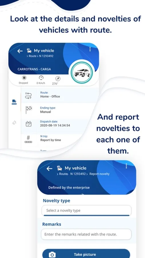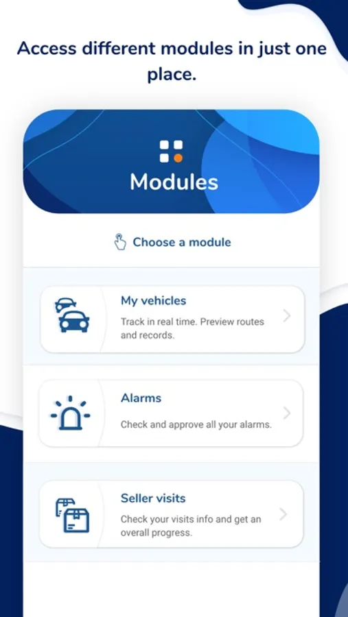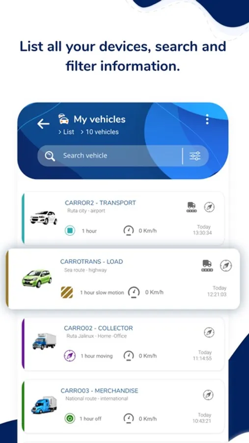 - Access all your vehicles or fleet and visualize them on lists and maps.