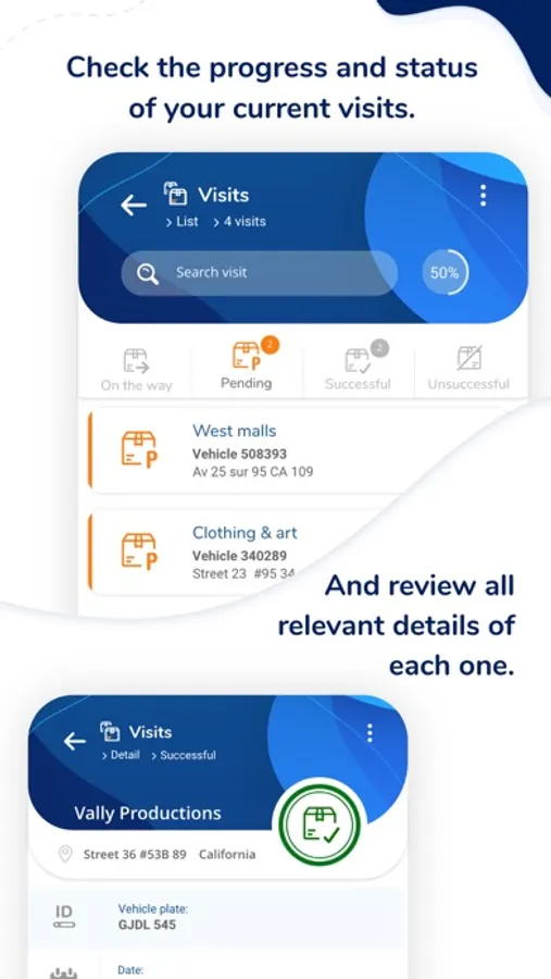 - Follow up your visits ordered by status: on the way, pending, successful, unsuccessful.