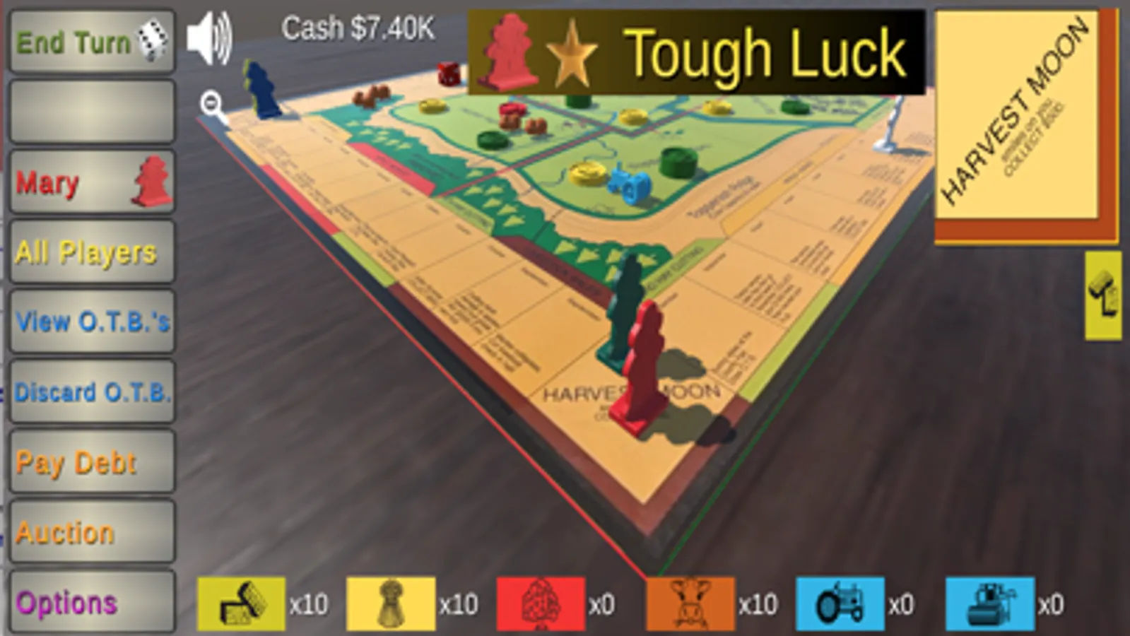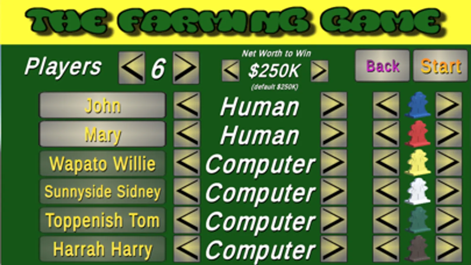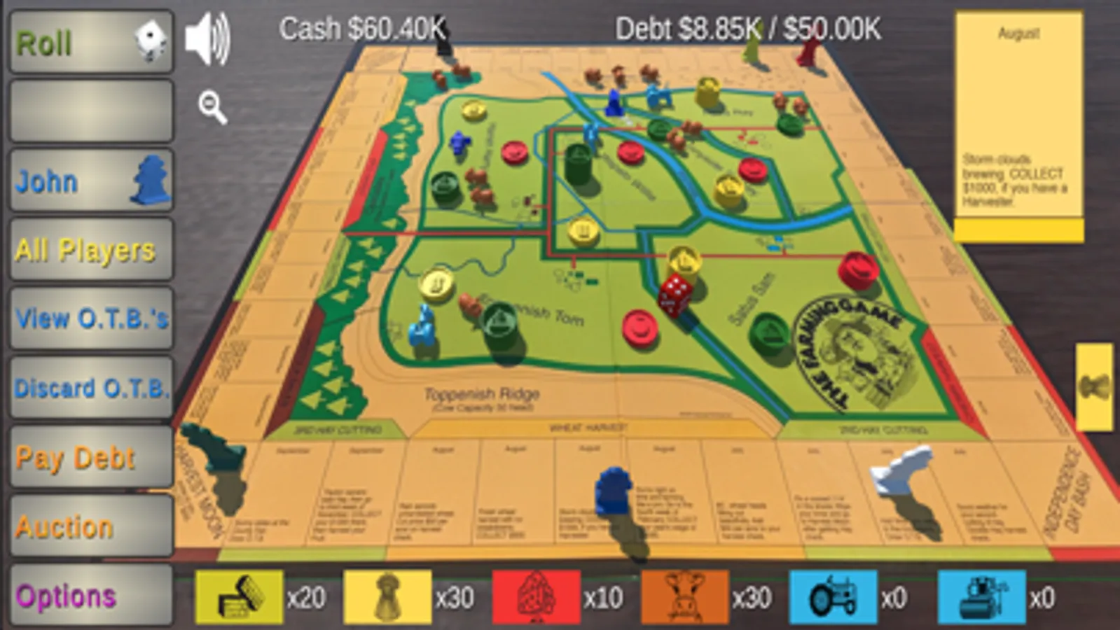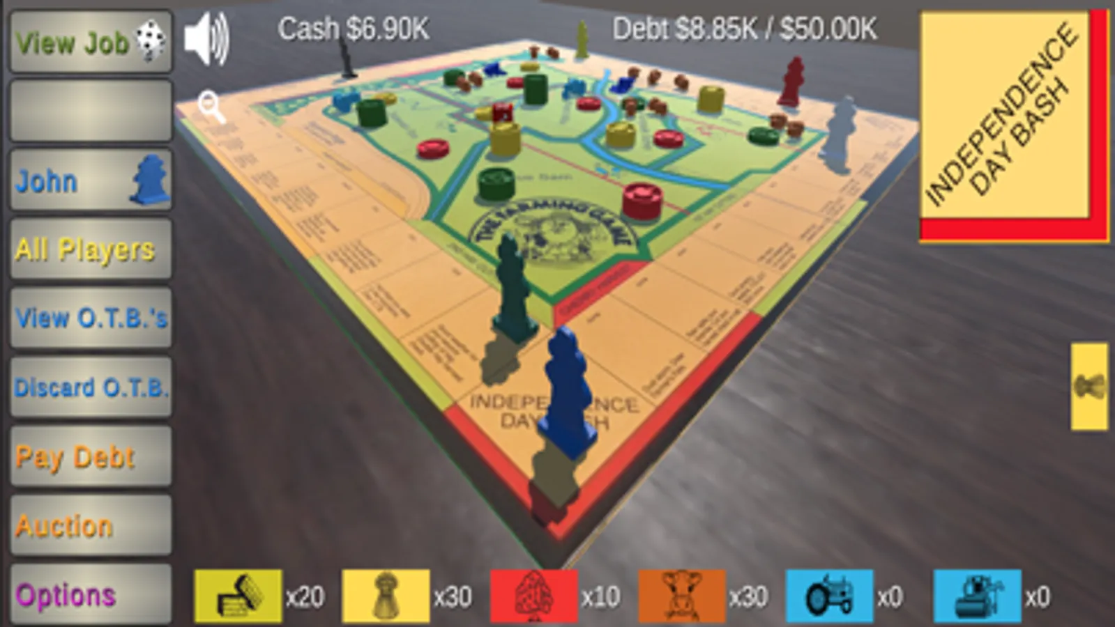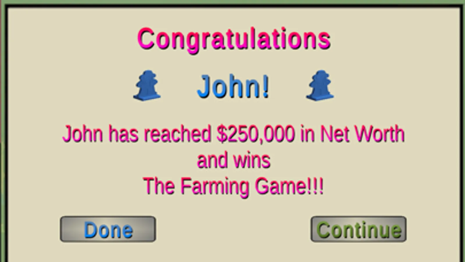 THE FARMING GAME®, a Monopoly style board game where players harvest crops with the roll of the dice, dodge droughts, uncertain markets and insects. Buy land, cattle, wheel and deal. Always different and always a challenge. Build the best farm in the county. A truly rewarding time that entertains, teaches and is just plain fun. An International award-winning game! Hundreds of thousands of copies sold. Fresh from the country. A classic family board game! So much fun, some people say it's the best game they've ever played, others call it addictive. This international award-wining game has sold hundreds of thousands of copies. So educational, it has been used by homeschoolers and thousands of schools around the world. So realistic, World Bank had it translated into Russian to assist farm privatization. Good clean wholesome fun. THE FARMING GAME ® is perfect for home on any rainy day or family get together, for a weekend up at the cabin, or down at the beach. A great gift for anyone, including yourself! One size fits all. PLOW THE BACK FORTY ON YOUR KITCHEN TABLE A board game is a dream machine, a vehicle to create an alternative reality. In THE FARMING GAME®, each player starts the game with 20 acres inherited from Grandpa. This property includes 10 acres in hay and 10 acres in grain. The 20 acres is not a large enough farm to make a living for a family, so each game farmer must also have a part-time job in town. With each completed trip around the game board you receive $5,000 from your year's wages to plow back into the farm. The object of THE FARMING GAME" is to build your farm large enough to be able to quit the job in town, come home to be your own boss, and farm full time. If you can do that without going broke, you win the game! $250,000 in total net assets are required to win THE FARMING GAME®. The gaming track is the calendar year, with a square for each week. Crops are harvested by the roll of the dice (about as much control as real farmers feel they have over yields and prices received for their crops). In THE FARMING GAME®, there is enough acreage for six players to diversify into a hay, grain, fruit, or cattle operation. Each individual farm is capable of pasturing 20 head of cattle. If any player wishes to run more than 20 cows, he can try to lease one of the range units in the hills. Warning: This family game is so much fun it may become habit-forming!
