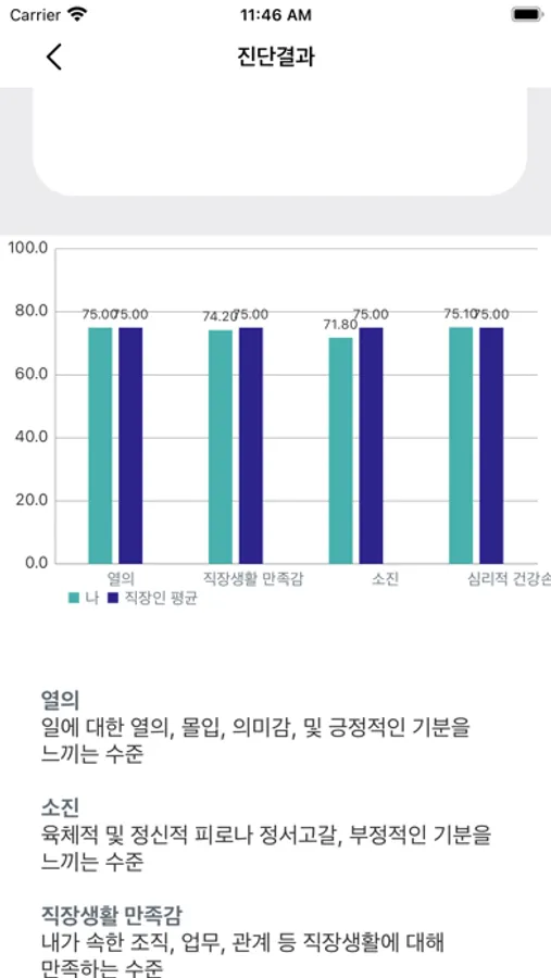 - 대한민국 평균과 조직의 수준을 비교하여 보완 및 개선점을 찾을 수 있습니다.