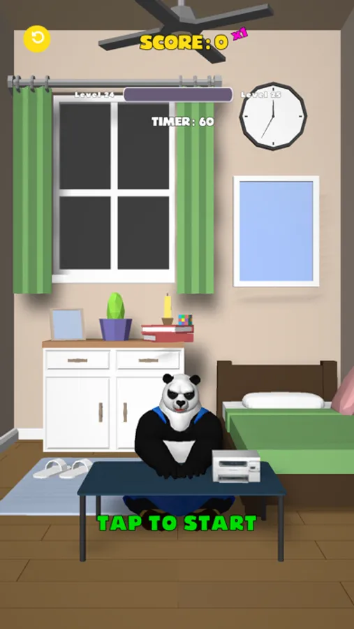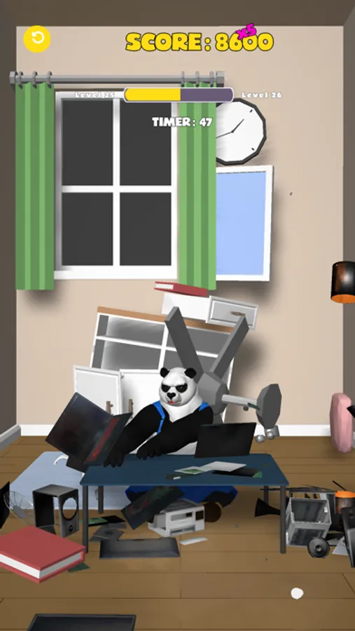 Help the Angry Panda to relax and control his anger by destroying everything possible.