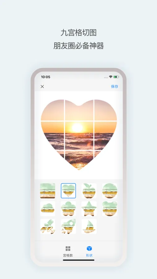 适合微信朋友圈晒图使用,支持多种形状的切图,支持九宫格和四宫格