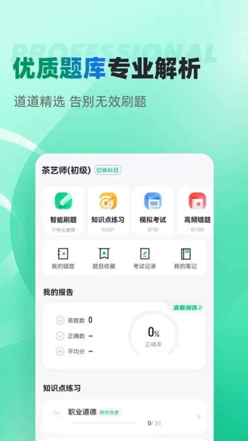 茶艺师题库内含考点练习,全国通用卷以及地区卷模拟练习,以及按照固定考试比重的随机式的抽题的真题考场,成绩单实时记录考试数据,一点一滴的反馈考生近期学习状态以及自我正确率的提升,大大的给予考生通过考试的信心。